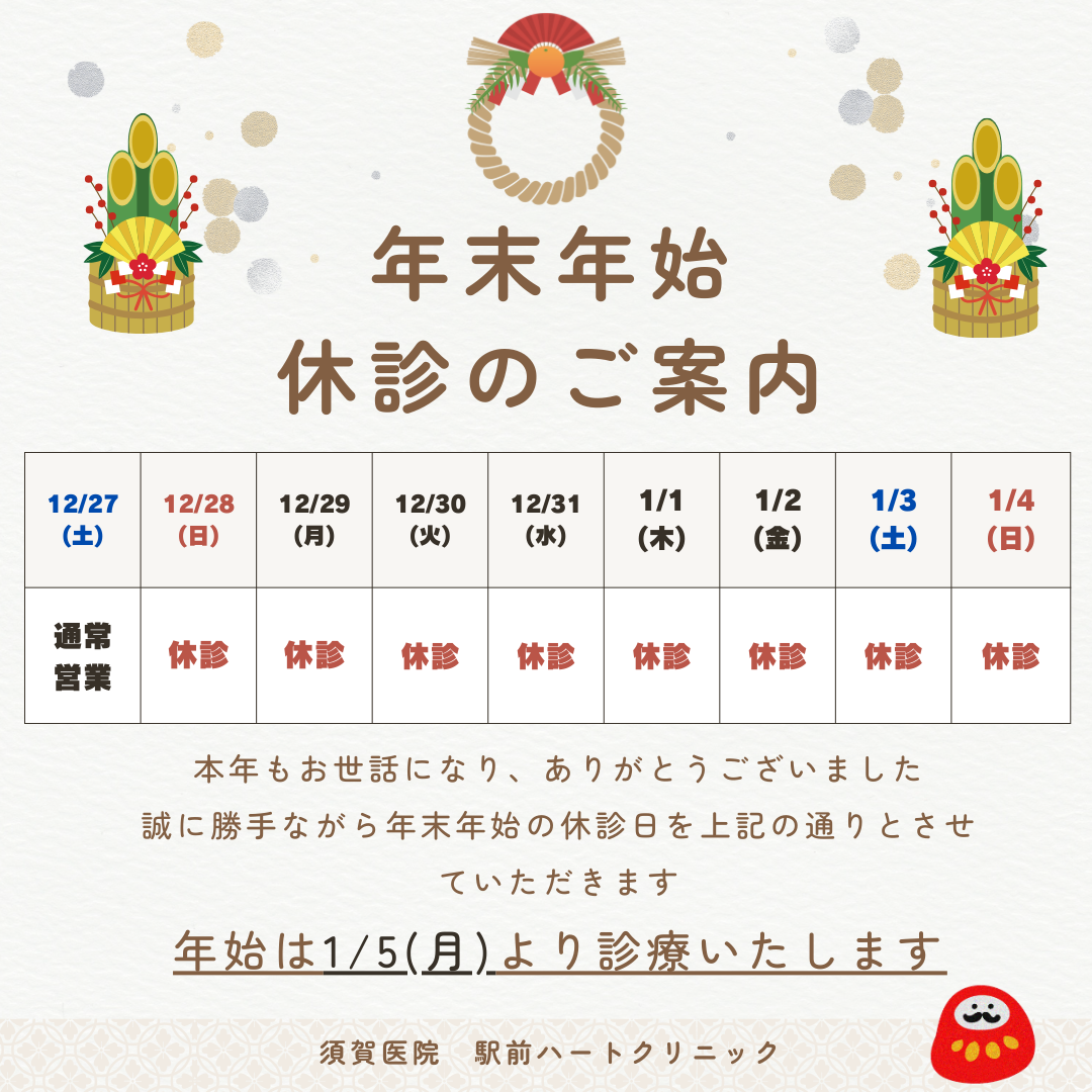 当院は下記の期間、年末年始につき休診とさせていただきます。